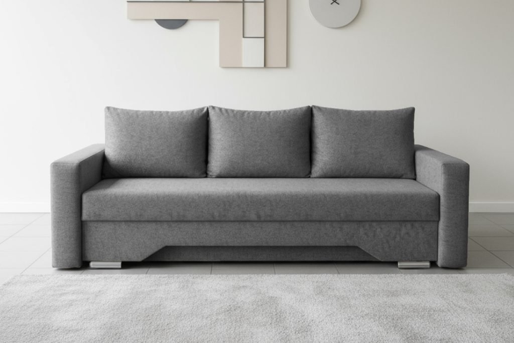 ARA EL-002 lietuviška sofa-lova su plačia miegama vieta, automatiniu išskleidimo mechanizmu, patalynės dėže ir spyruokliniu pagrindu. Patogi kasdien.